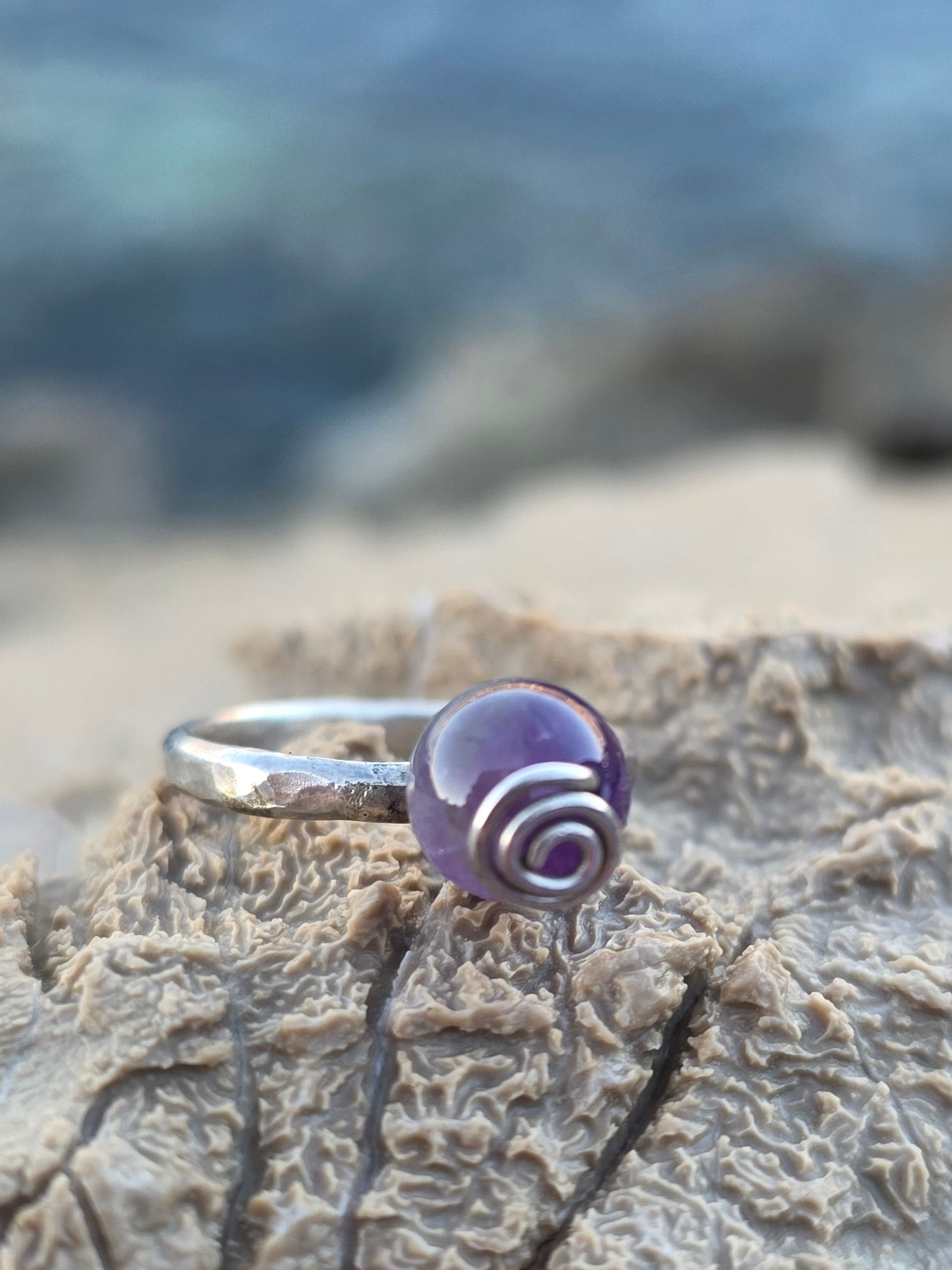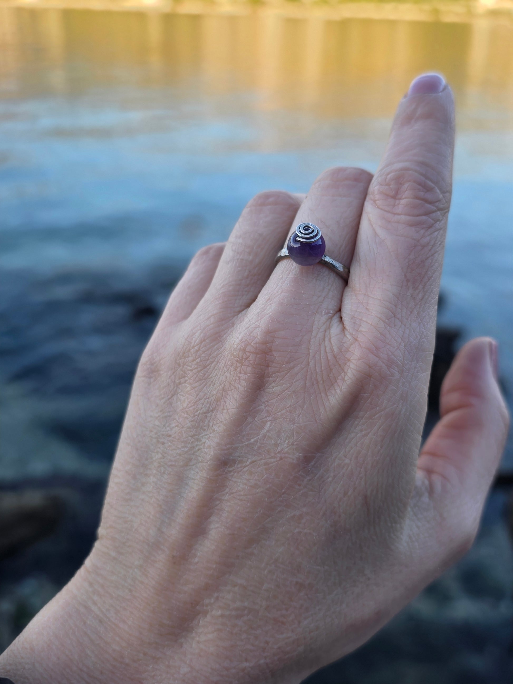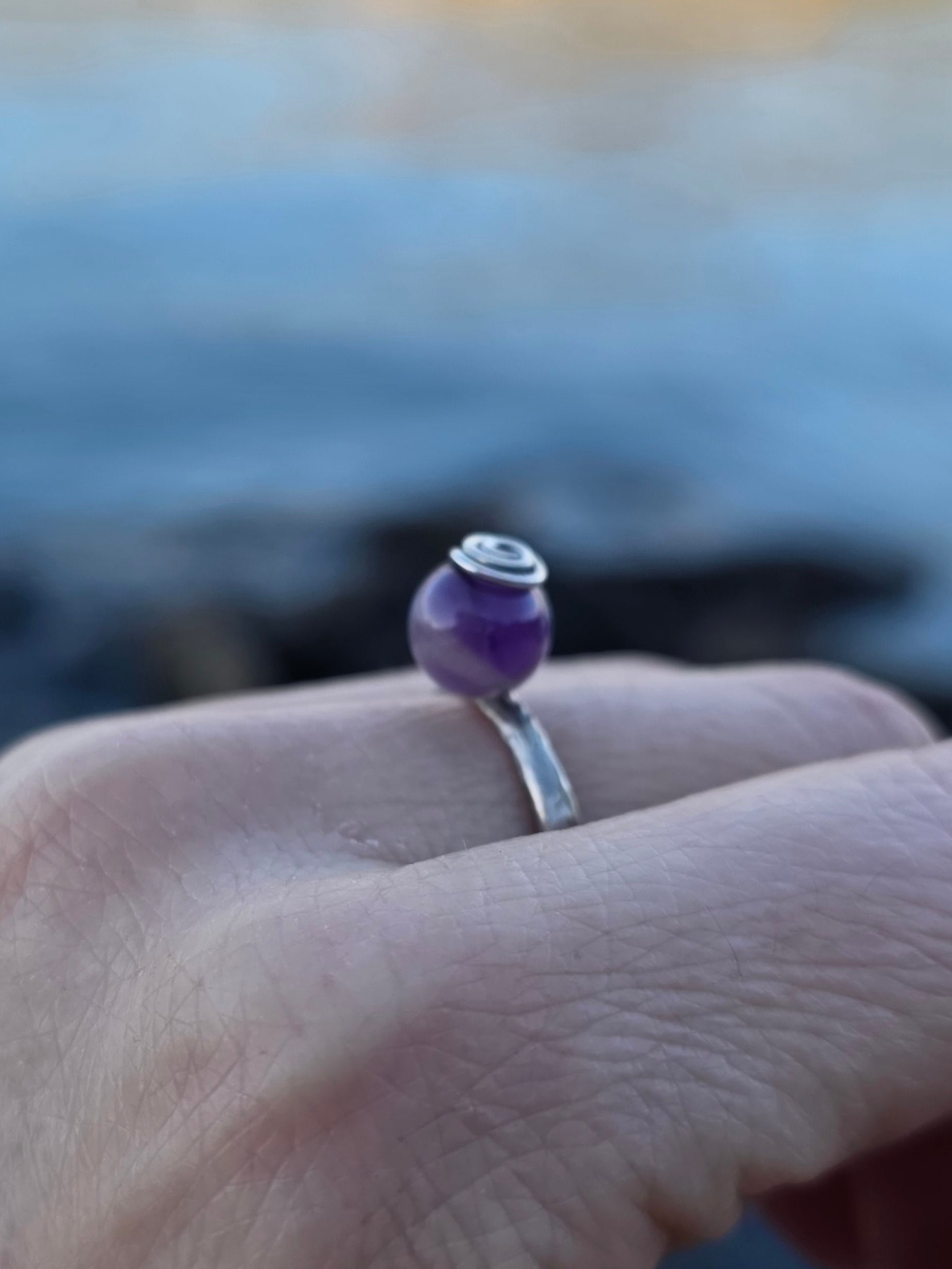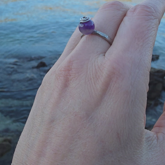 Nježan, minimalistički prsten od 925 srebra s malom kuglicom od ametista (8 mm) koja podsjeća na bovicu na moru. Ručno izrađen, lagan i udoban za nošenje svaki dan.