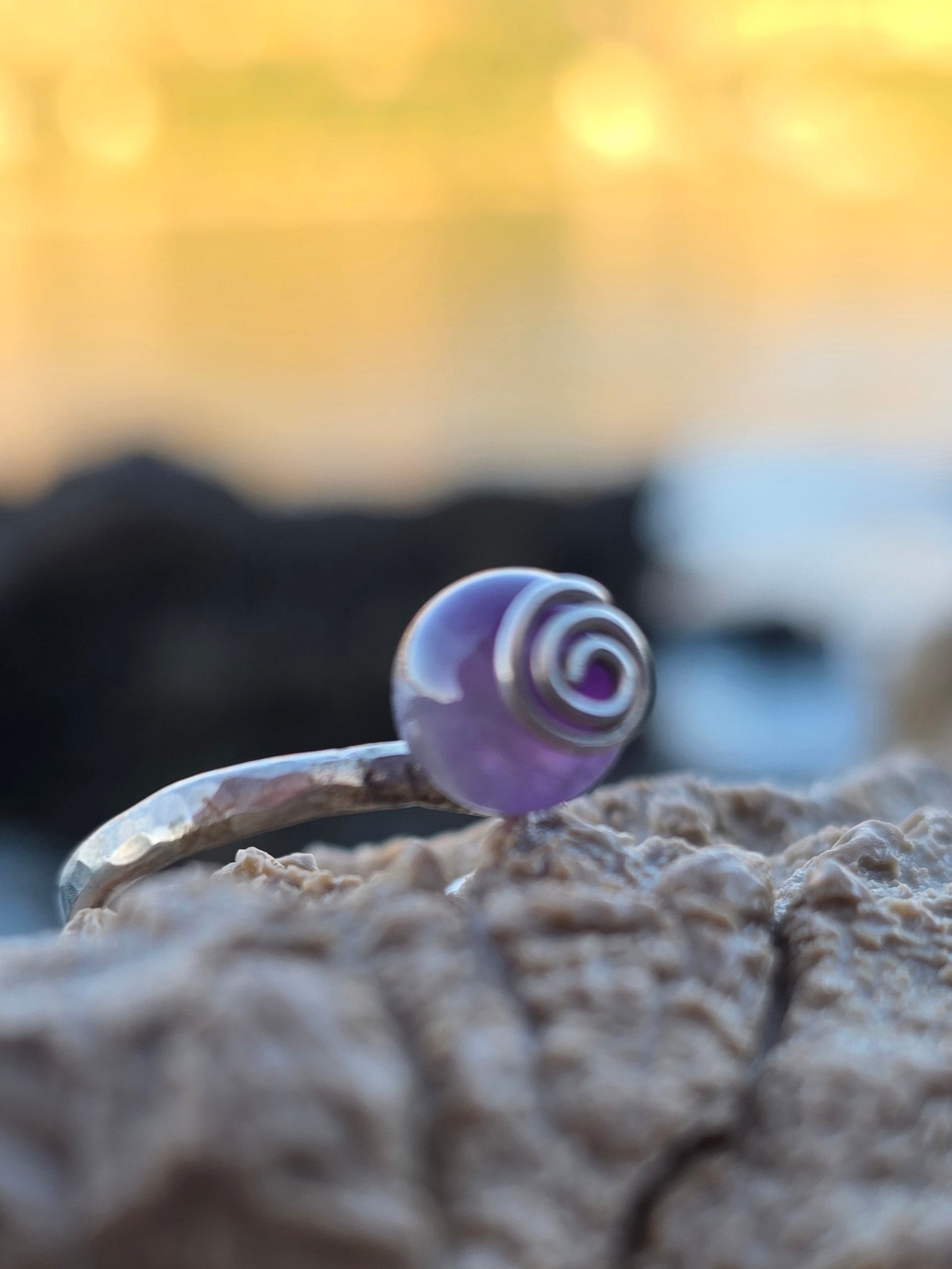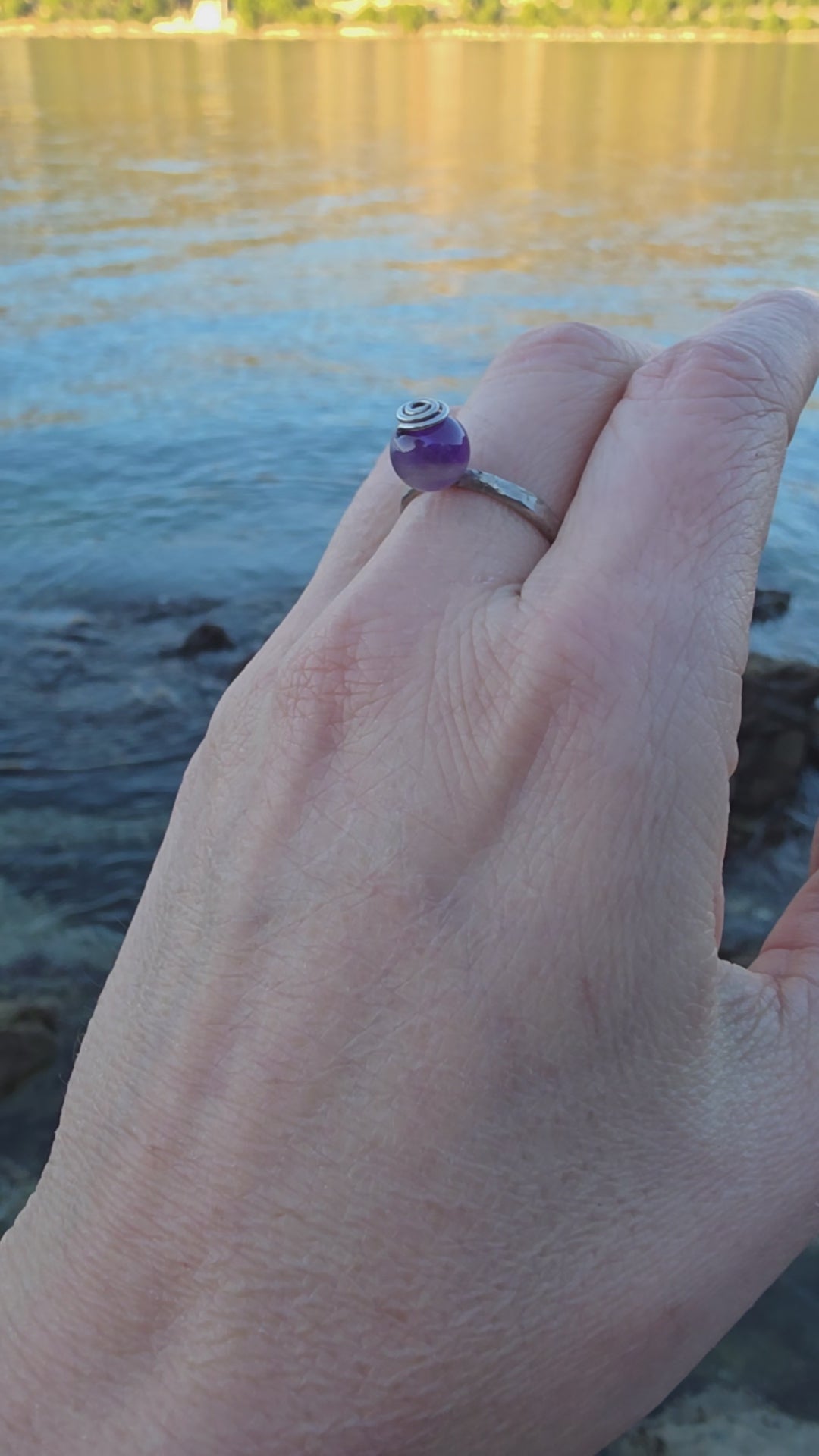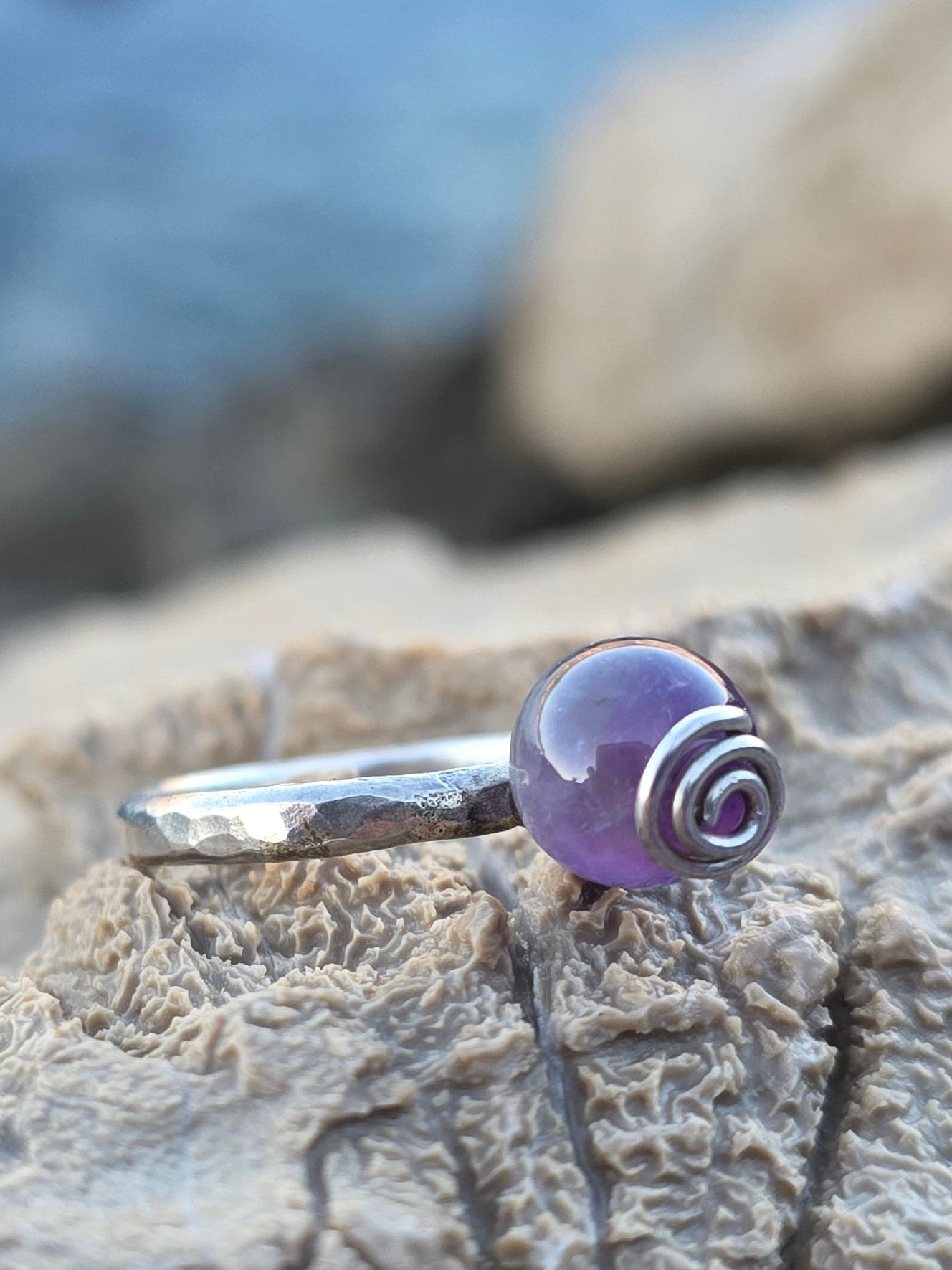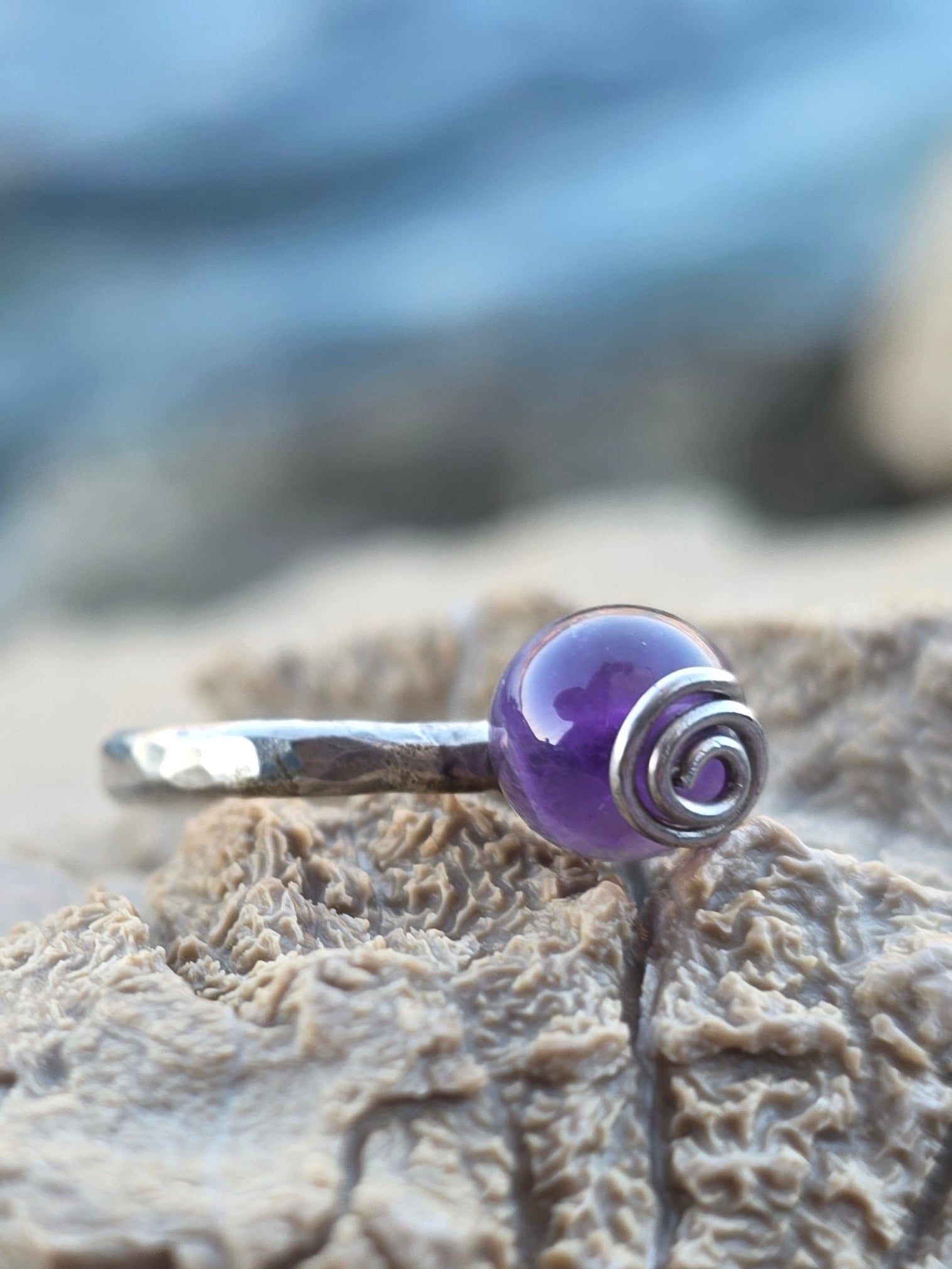 Nježan, minimalistički prsten od 925 srebra s malom kuglicom od ametista (8 mm) koja podsjeća na bovicu na moru. Ručno izrađen, lagan i udoban za nošenje svaki dan.