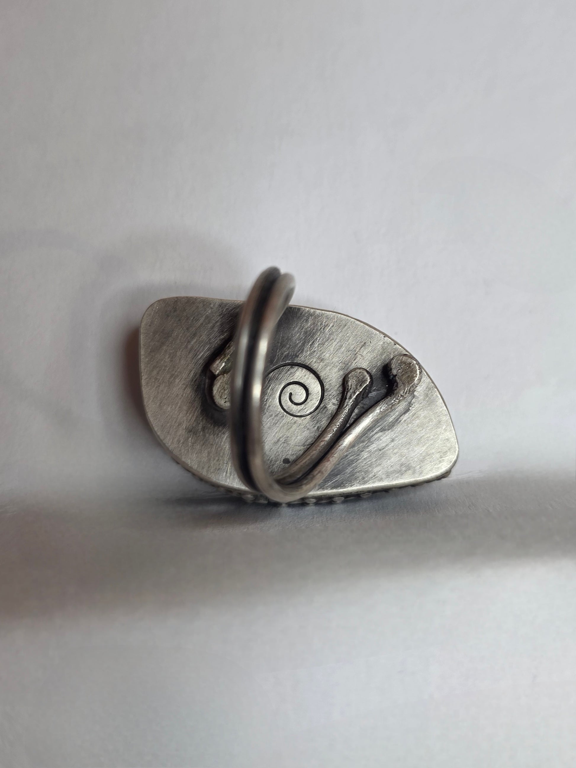 Prsten je podesiv i udoban, ali vizualno snažan — statement komad koji se ne uklapa, nego se ističe.