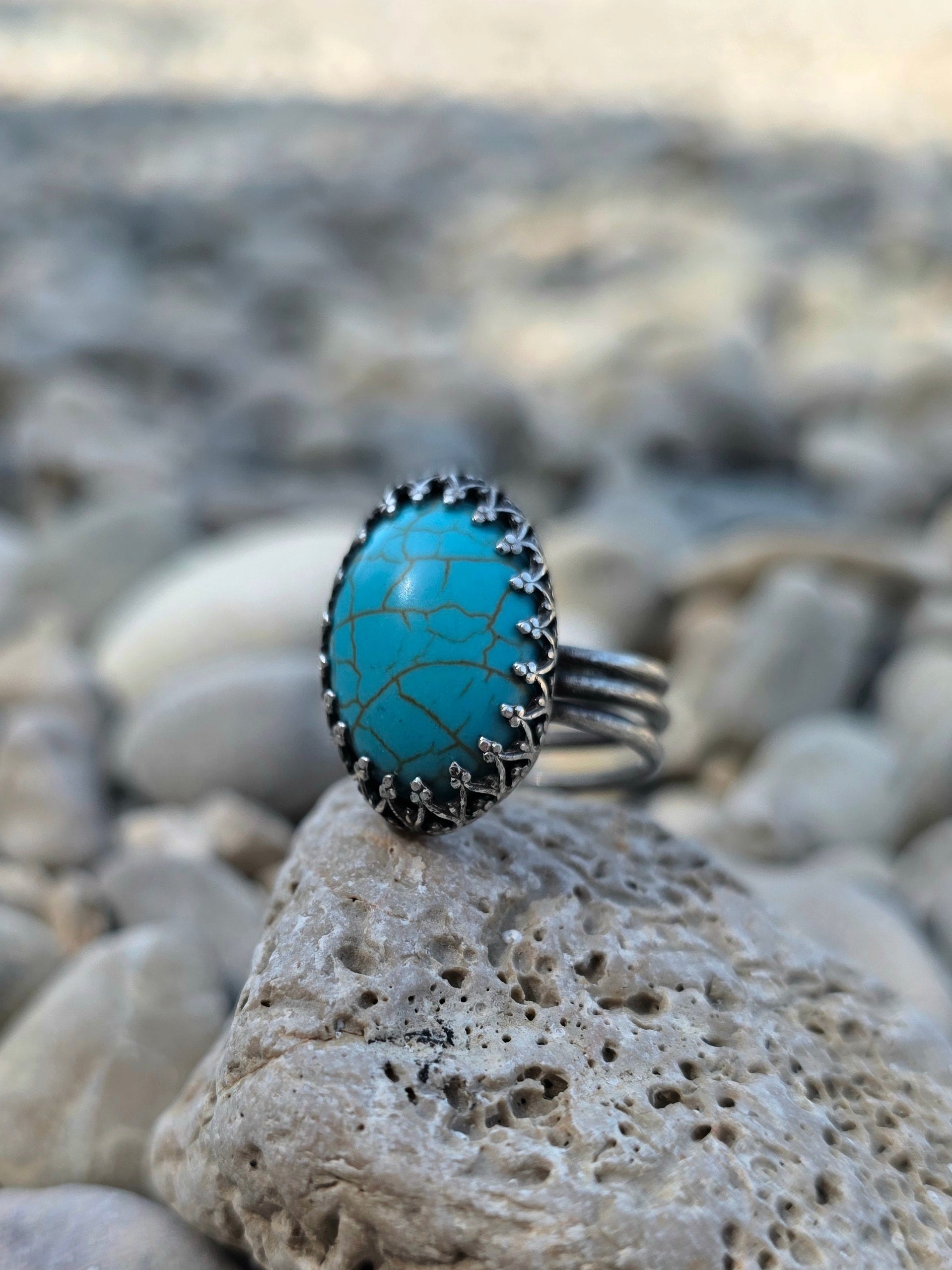 Prirodna mrežasta struktura tirkiza daje mu karakter, kao da u sebi nosi mapu svih pukotina koje su se pretvorile u snagu. Upravo ta sirova, iskrena ljepota čini ovaj prsten posebnim — ne pokušava biti savršen, nego autentičan.